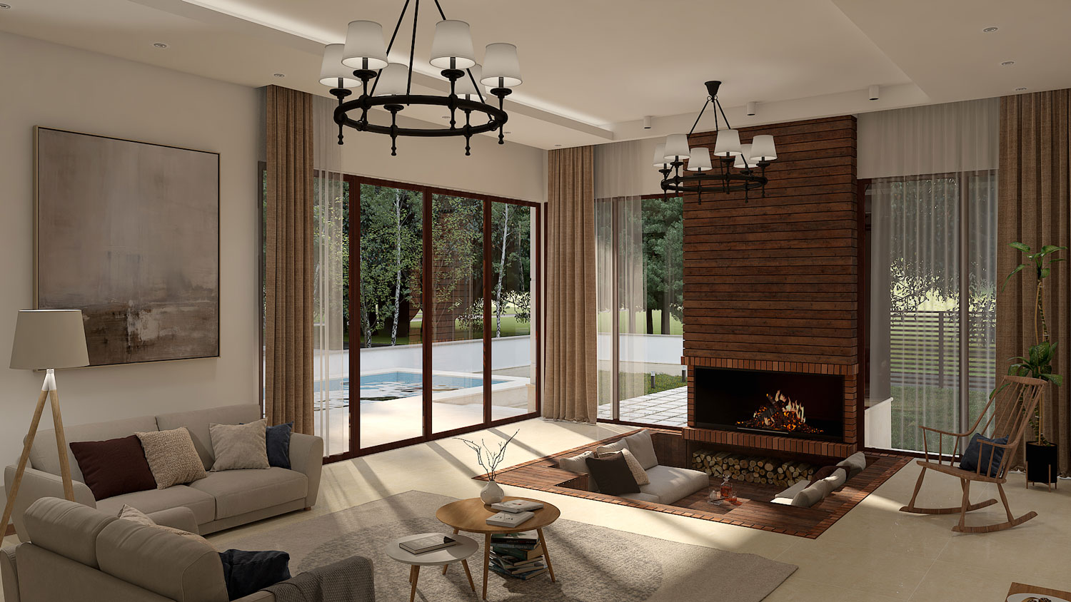 بنابراین فضایی دنج شکل طراحی شده در کنار شومینه و همچنین دید مناسب در نظر گرفته شده با پنجرههای کشیده سرتاسری، فضای شاخصی را در ساختار پلانی ایجاد نموده است.