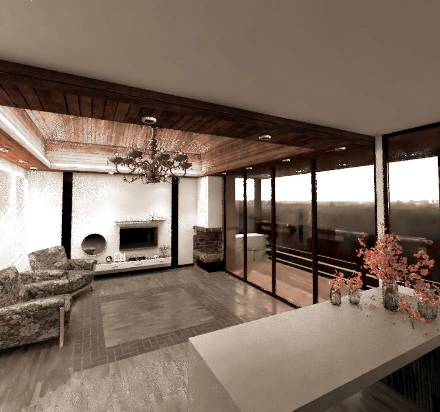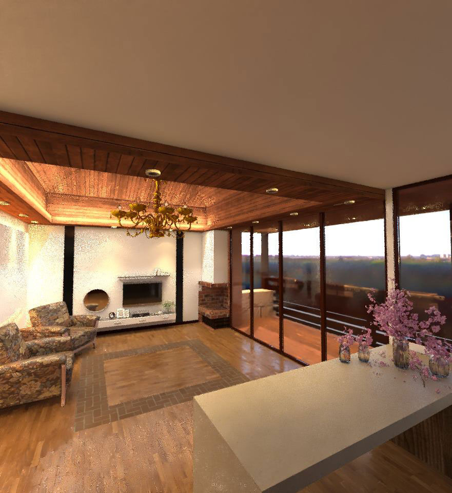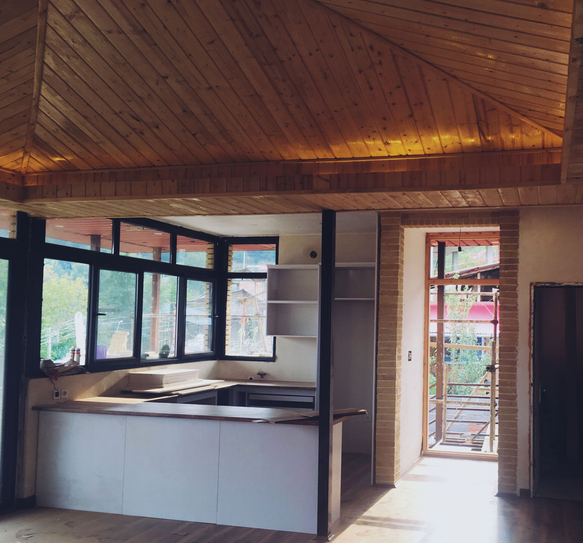 سقف شیبدار و لمبههای چوبی شمالی را به داخل کلبه بردیم. ارتفاع سقف را زیاد کردیم تا فضا را بزرگتر نشان دهد.